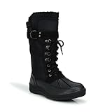 Stay warm on or off the slopes in buckled detailed lace up snow boot. Fab faux shearling lined the stylish mid-calf for extra comfort.Approx. Heel height: 1 1/4".Approx. Boot shaft: 9"; Calf circumference: 13 ".Size Runs: True to size.Closure: Side zipper.Main Color: Black.Material: Man Made (PU) and nylon. Style Name: Bre-01.(SKU:BRE-01-BLK-PU)
