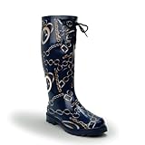 Classic rain boot fashioned the preppy style with ample chain link design and whimsical lace tie at top. They are amazingly lightweight and completely waterproof. Approx. Heel height: 1".Approx. Boot shaft: 13"; Calf circumference: 12". Material: Rubber. Size Run: True to size. Available in whole sizes only, next size up is recommended for half size. Style Name: WR-9119. (SKU: WR-9119)